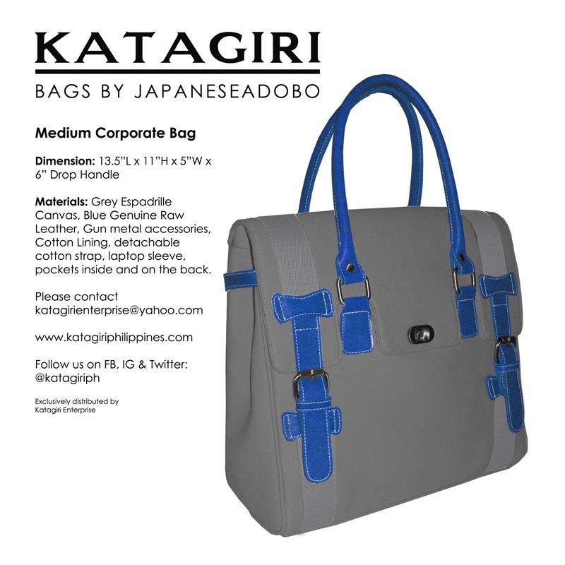 The first ever design made under the JapaneseAdobo line of bags made of structured espadrille cotton canvas with genuine cowhide leather trimmings. One of the best sellers and remained to be the most patronized designs. Available in three (3) sizes: small, medium and large.