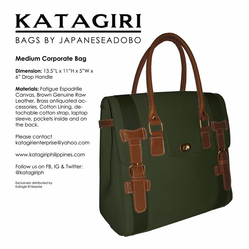 The first ever design made under the JapaneseAdobo line of bags made of structured espadrille cotton canvas with genuine cowhide leather trimmings. One of the best sellers and remained to be the most patronized designs. Available in three (3) sizes: small, medium and large.