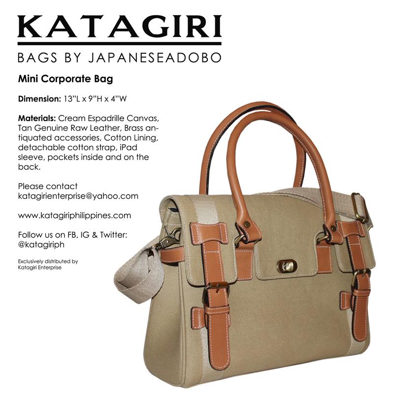 The first ever design made under the JapaneseAdobo line of bags made of structured espadrille cotton canvas with genuine cowhide leather trimmings. One of the best sellers and remained to be the most patronized designs. Available in three (3) sizes: small, medium and large.