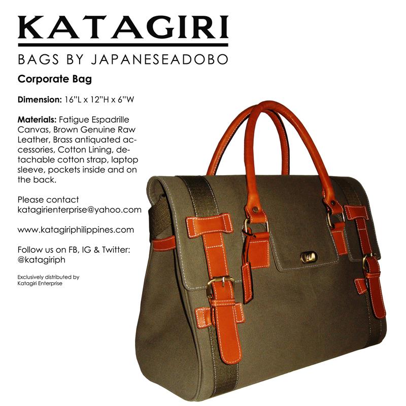 The first ever design made under the JapaneseAdobo line of bags made of structured espadrille cotton canvas with genuine cowhide leather trimmings. One of the best sellers and remained to be the most patronized designs. Available in three (3) sizes: small, medium and large.